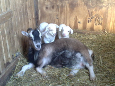 Diese Seite soll unserer alten Polly gewidmet sein. Sie war eine der ersten Ziegen, die bei uns geboren wurden (neben noch zwei Geschwistern, die auch noch leben). Diese kleine Mini-Zwergziege wird nie den Bestand verlassen. Sie hat bei uns sozusagen eine "Lebensstellung". Wenn wir die Herde umtreiben müssen bzw. im Frühjahr raus und vorm Winter wieder rein, dann müssen wir nur Polly an die Leine nehmen und der Rest marschiert brav hinterher. Polly lammt immer von einem unserer Böcke. Es ist schon Wahnsinn, wie diese kleine Ziege es immer wieder schafft und solche großen Lämmer auf die Welt bringt. Die Lämmer auf den Foto sind nämlich zur Zeit der Aufnahme nur einen Tag alt!